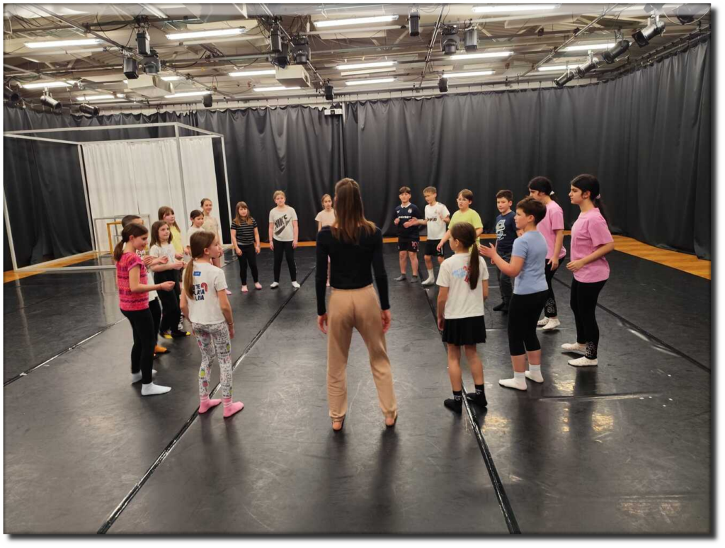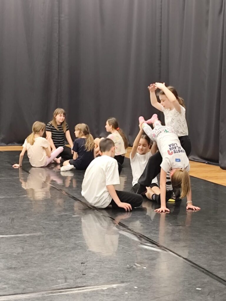Želja koja se javila u dječjim glavama dok su bili gledatelji ostvarena je u radionici koja je, nakon predstave, pod vodstvom studentice Klare, naše četvrtaše pretvorila u plesače, koreografe, scenografe… Slobodni u trčanju pozornicom, stvaranju skulptura od vlastitih tijela, hodajući prstima u mini cipelama, naši su četvrtaši osvajali nedostižne visine i  pokazali kako je važno da igra bude i ostane ne samo dio djetinjstva već cjelokupnog našeg života.