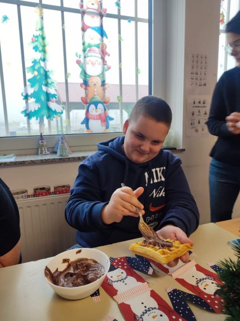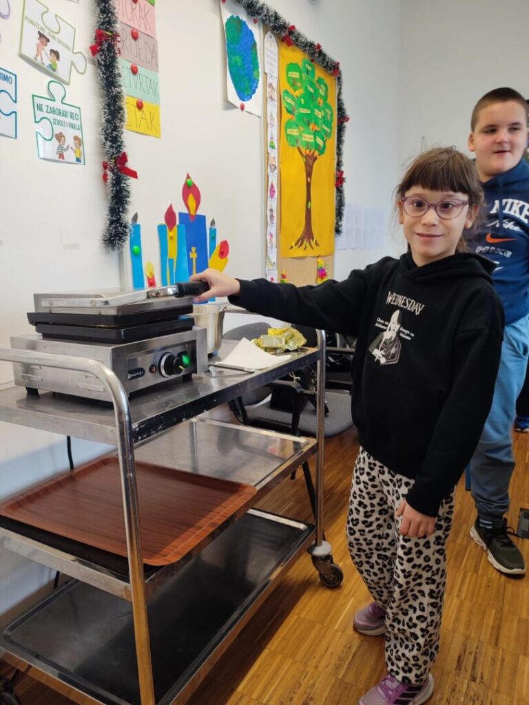 Učenici posebnog razrednog odjela, u sklopu nastave domaćinstva, zajedno s edukacijskom rehabilitatoricom sudjelovali su u zanimljivoj i praktičnoj aktivnosti pečenja vafla. Kroz ovu aktivnost učenici su razvijali svakodnevne životne vještine, suradnju i samostalnost, a cijeli je prostor bio ispunjen ugodnom, božićnom atmosferom. Mirisi svježe pečenih vafla, uz blagdansko raspoloženje, izmamili su osmijehe na lica svih sudionika!